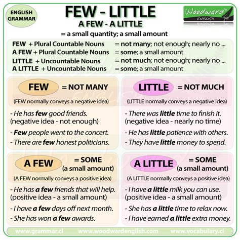Few (untuk kata benda yang dapat dihitung) dan Little (untuk kata benda yang tidak dapat dihitung) berfungsi untuk menggambarkan jumlah atau kuantitas sebuah objek yang sedang dibicarakan dalam arti negatif (sedikit sekali dan hampir tidak ada)